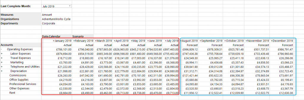 If our last complete month is July 2019, we can see that the available months for Actuals are January 2019 – July 2019 and the forecasted months are August 2019 – December 2019.