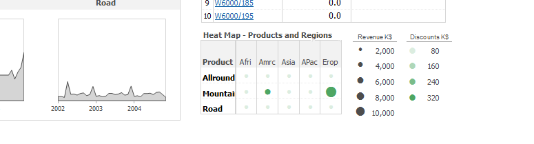 This Heatmap Table shows you the revenues and the discounts of a company over the course of one year per product group. The size of a bubble shows the revenue made in a particular month and the bubble color shows the discount rate given. The discount rate has been encoded as a range of green colors, ranging from a light green, for low discounts to a dark green for high discounts. The years and product totals are shown at the right and bottom as an integrated part of the table.