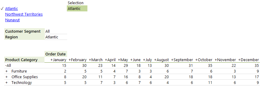 Would move the Product, Region and whichever hierarchy is in $a$1 to the columns (I could use a slicer or drop down to update $a$1 to let the user switch between various hierarchies)