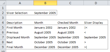 Previous and Next are again achieved using MemberNavigate, this time the syntax will be:  XL3MemberNavigate(1,”[Time]”,SlicerData!$B$7,”Previous”).