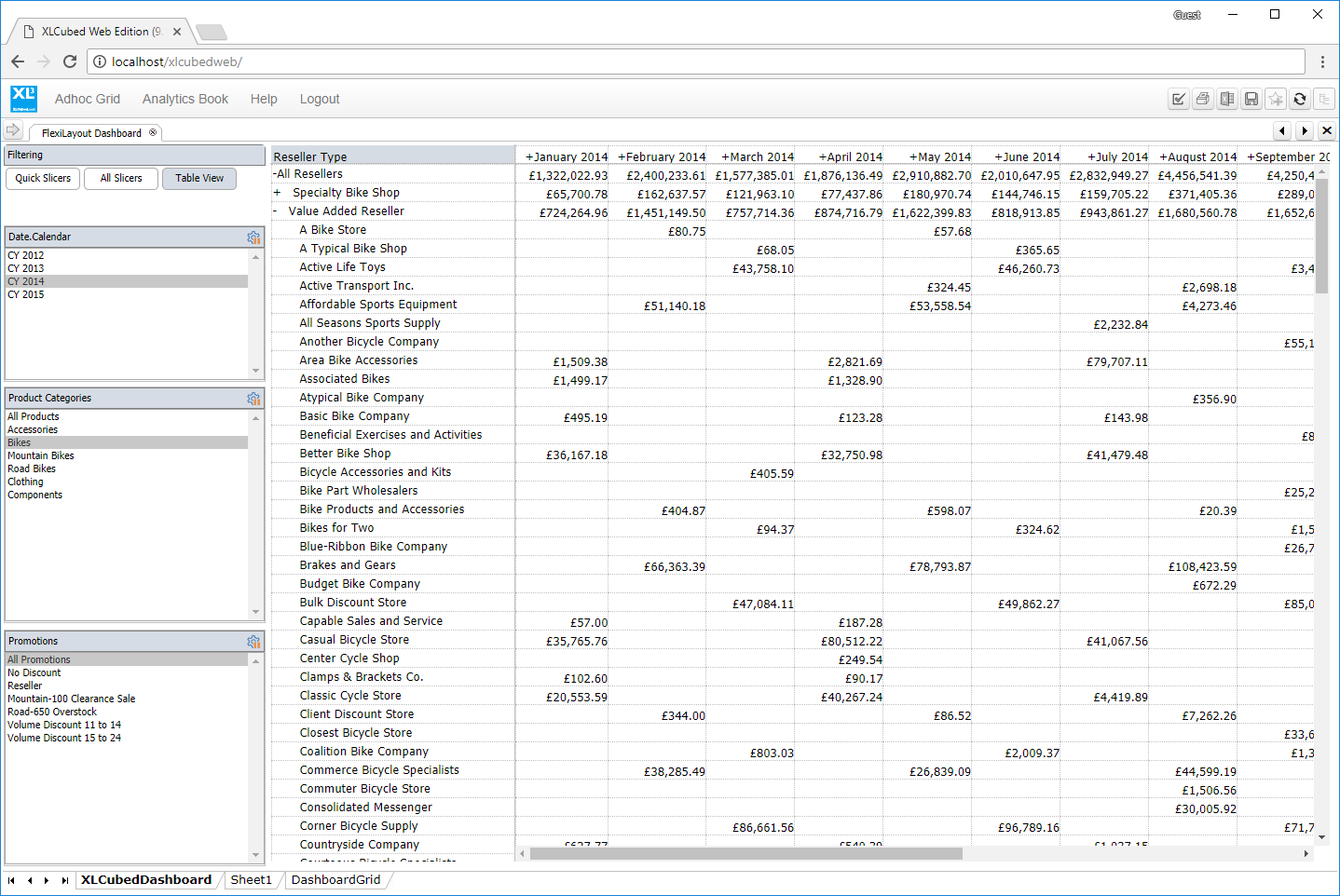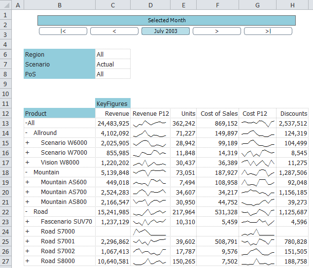 In our example we’ve just connected one grid, but there can be as many as required. Our example also gives some sales and costing detail for the main product categories. We also use in-grid sparklines to give a feel for the trend, and these can be drilled or sliced and diced in the same way as a standard grid.