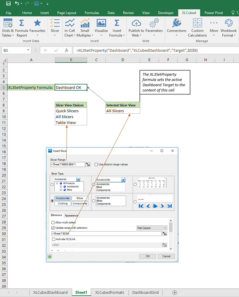 Finally, we can use the XL3SetProperty() formula to set the active Target for the dashboard, based on the output of the slicer we just set up. The syntax is: